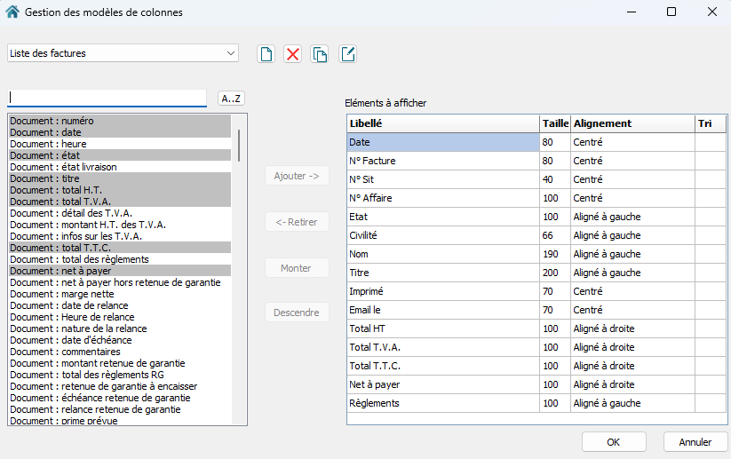 > Dans la fenêtre, personnalisez le modèles de colonnes en ajoutant / supprimant et modifiant les libellés souhaités
