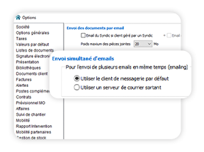 - Dans le menu Fichier > Options, rendez-vous dans Emails puis sélectionnez l’envoi simultané d’emails.